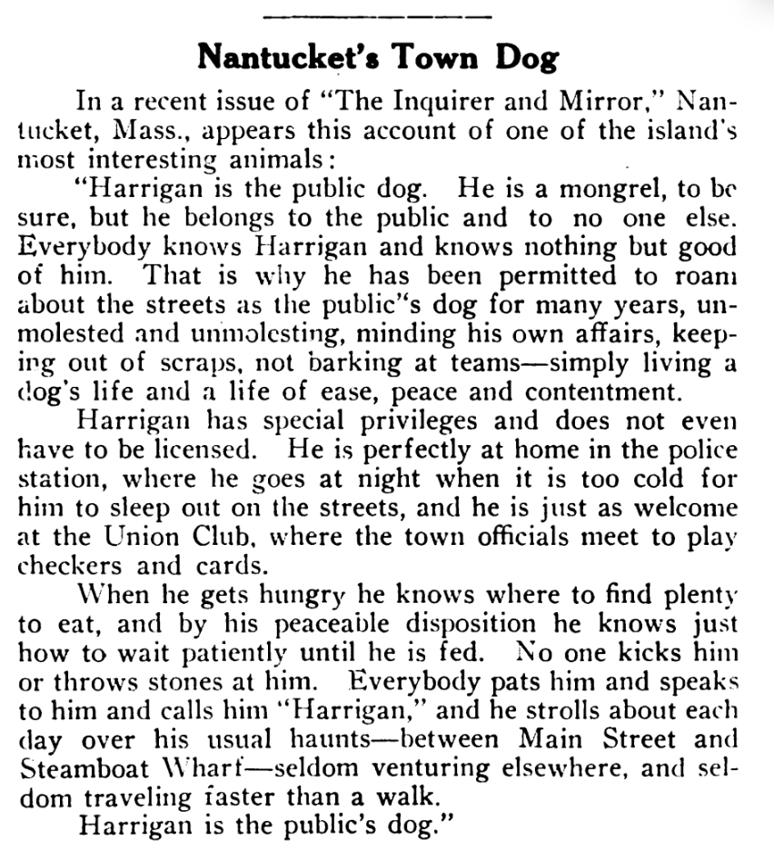 The first piece is about Harrigan, a stray dog who lives in Nantucket. Zoophily commonly argued for humane treatment of street dogs and often protested the need to bring dogs in to the shelter at all. It seems that Harrigan was doing just fine on his own.