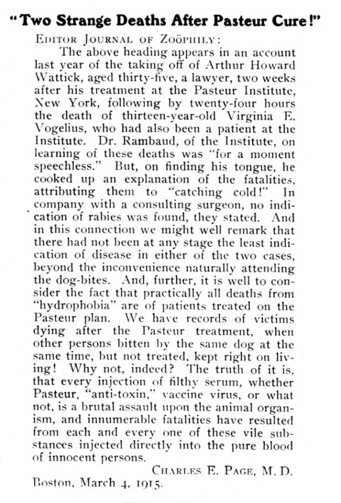Zoophily often also discussed the effectiveness of the Pastuer treatment and was quick to point out that most dogs that bit people were not rabid, and could be held in shelters and observed for signs of rabies instead of being destroyed and tested. The periodical often also questioned whether rabies or hydrophobia was real at all, and argued that people who were bitten were also just as apt to die of “Lyssophobia” or the fear of rabies itself. There were often also articles questioning the effectiveness of vaccines.