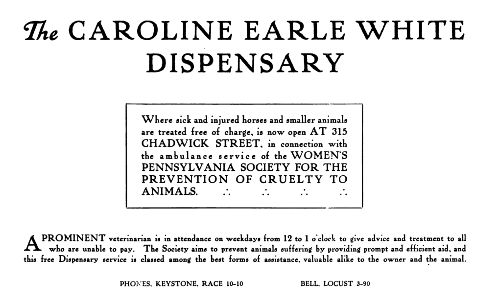 Among the advocates of this time was Caroline Earle White. Caroline was critical to the animal welfare movement for so many reasons and deserves much more than these short paragraphs. Her name is familiar to many in the field as the founder of the animal welfare movement in Philadelphia; With her husband, attorney Richard P. White, she founded Pennsylvania SPCA and then (because a woman could not serve on the board of the “official” SPCA, a women’s branch of the same organization, Women’s Pennsylvania SPCA. Both organizations still exist today and are considered the first true animal shelters.