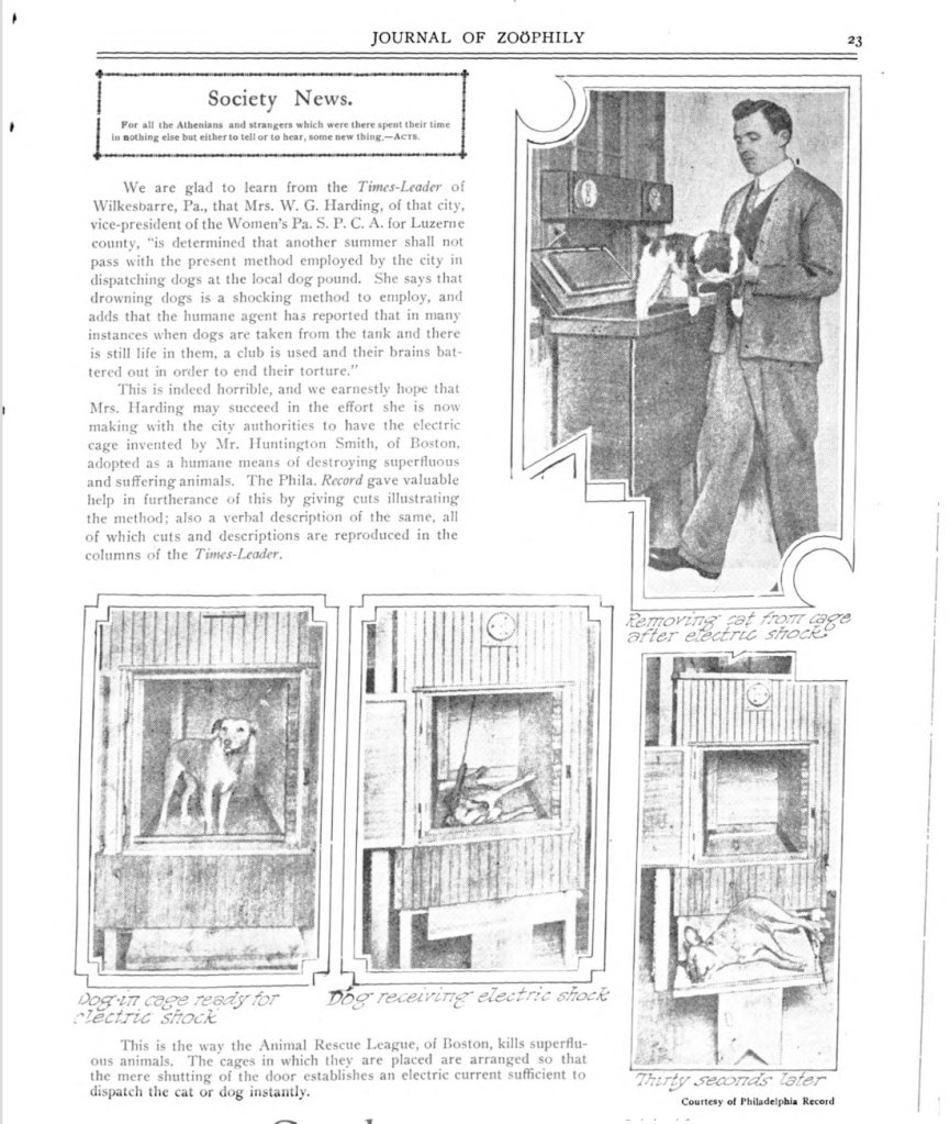 In the Journal of Zoophily’s May of 1912 issue, between a quote from Abraham Lincoln (“With malice toward none and charity toward all.”) and an article about the recent tragedy of the Titanic, is an article from its editor-in-chief, Caroline Earle White. She is reporting on the Third Conference of the Anti-Vivisection Societies of the Eastern States, held the 15th of April in Boston. The article describes the conference, its attendees, and a visit to Animal Rescue League, where a new invention is seen. The automatic electric cage is described as “a small, attractive looking closet, large enough for a dog to stand up in comfortably. It is well lighted and ventilated, and above the door is placed a mirror in which one can see the actions of the animal about to be killed.” Caroline continues to describe the closet, the inspiration behind it’s creation (lightning), the painless deaths of several animals placed into it. She calls it a “most valuable discovery.” I will share the entirety of the article below.