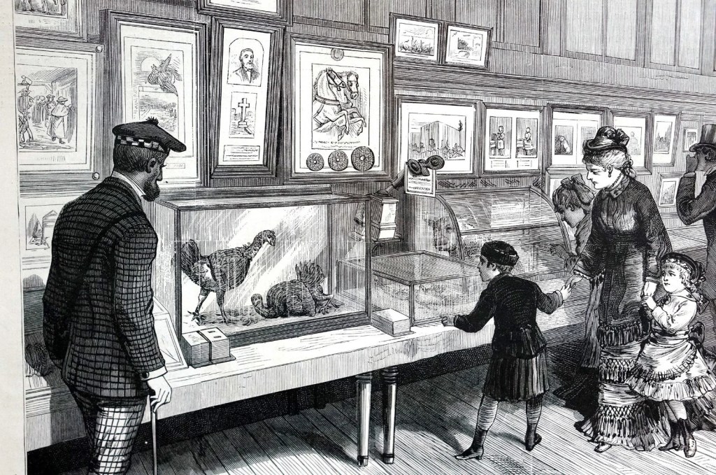 I was able to obtain a copy of an article about Bergh’s exhibit by buying an engraving from an issue of Frank Leslie’s Illustrated Newspaper, January 13, 1877, on Ebay. A photocopy of the article was included, and I’ll paste it below even though the quality is not that great. It was NOT easy to come by and I’m pretty excited to have it. The article describes the exhibit as such: