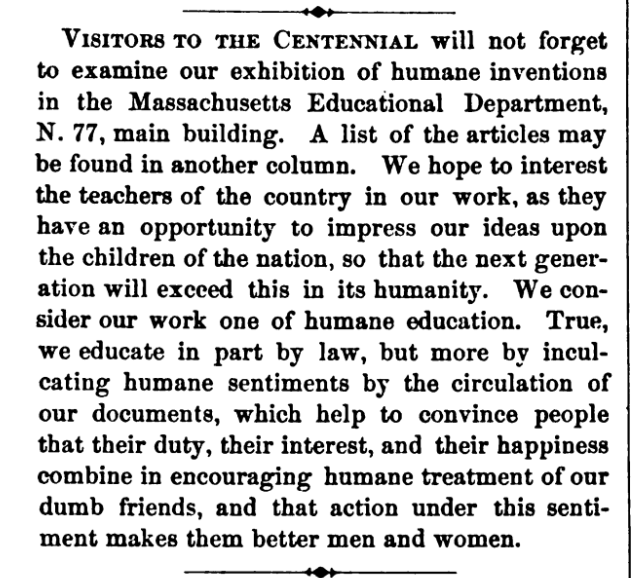 In the February, 1876 issue of “Our Dumb Animals,” the monthly periodical of the Massachusetts Society for the Prevention of Cruelty to Animals, we see an enthusiastic ad requesting humane inventions for display in Philadelphia. The Massachusetts SPCA was to be in the educational exhibit in the main building, number 77.