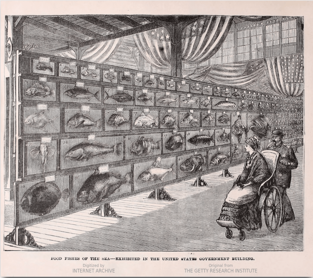 More than 200 buildings were constructed on the grounds, including special hotels made specifically to house visitors, which came from all over the world to see the exhibits. Special railroads into the event areas were created, and 27 of the 36 states also had their own “house” built in a style representative of the area’s history and architecture along a special avenue. Along with the main hall, there was an agricultural hall, a machine hall, a woman’s pavilion, a horticultural hall, and many smaller outbuildings. The Statue of Liberty’s hand and torch were on display, the rest of the statue soon to be forthcoming. There was a fire-works display described as the biggest in all of history. There was a tournament featuring fifteen knights, and a wall of every edible fish in the sea, in taxidermy. In short, it was a spectacular example of everything that makes this period in Victorian America so special.