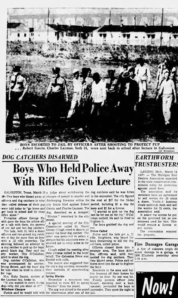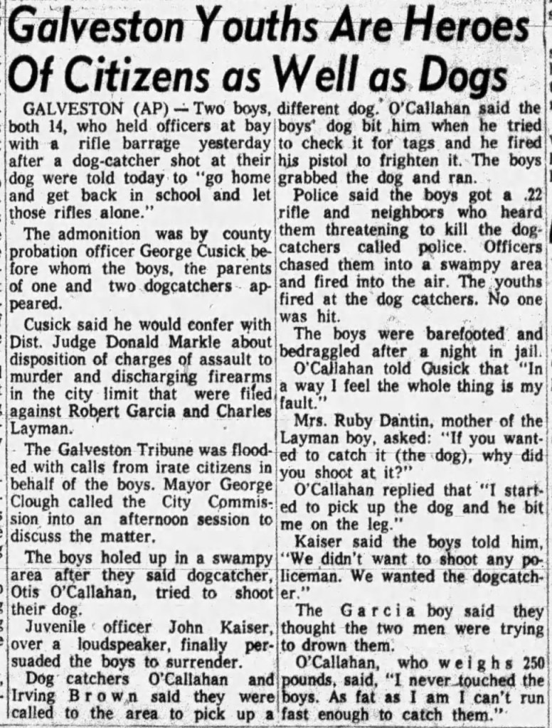The Battle of Island City quickly moved from the marsh to the court of public opinion. Did the citizens of Texas decry the violence and disrespect of youth? Did the city leadership rally behind their dog catchers, whose lives had been threatened? No. Not in the least. The mayor openly lamented the complaints he had previously received about the dog catchers’ methods. The public outcry was also swift, substantial, and nearly universally in favor of the boys and their quest to save Blackie. Newspapers were “flooded with calls from irate citizens”, and Mayor George Roy Clough acknowledged receiving “dozens of calls from angry citizens”. A “Save Blackie” campaign was started to cover the $17 redemption and boarding fee for Blackie, that campaign raised nearly $190 (over $2,000 today)! The public pressure led to swift and decisive action from city officials, resulting in the immediate disarming of the city’s dog catchers. A day later, the entire dog-catching team was fired, and the anti-stray dog campaign was suspended.