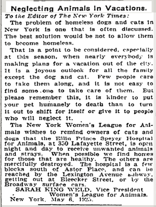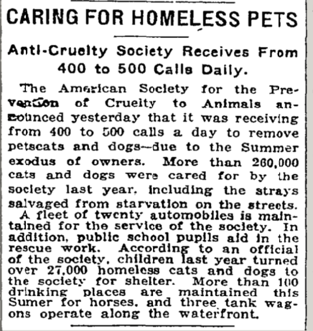 A place this was evident in the 1920s was in newspaper articles encouraging or acknowledging intake into the shelter before and during summer vacations. Two such articles are listed below. It’s noteworthy to see that there was absolutely no expectation that the shelters would attempt to live outcome the animals at all. While at this time this was still understandable due to lack of resources, it’s very interesting to acknowledge the language and expectations we were setting with the general public around what a shelter is, and what a shelter was for.