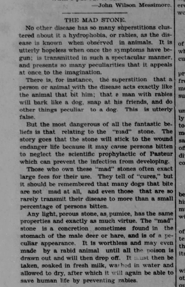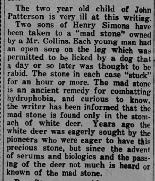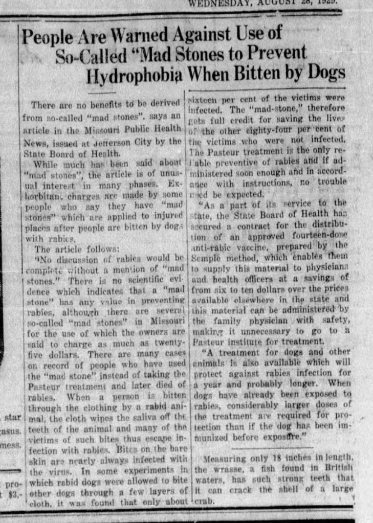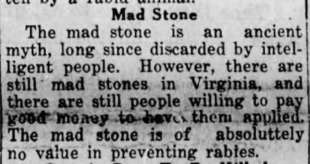 Interestingly, mad stones were still in use in many places in the United States during this time. This was so much so that people were avoiding the Pasteur treatment in deference to mad stone use. Newspapers would go out of their way in articles about hydrophobia to talk about them and encourage people not to use them. I found a run of such articles in 1929: