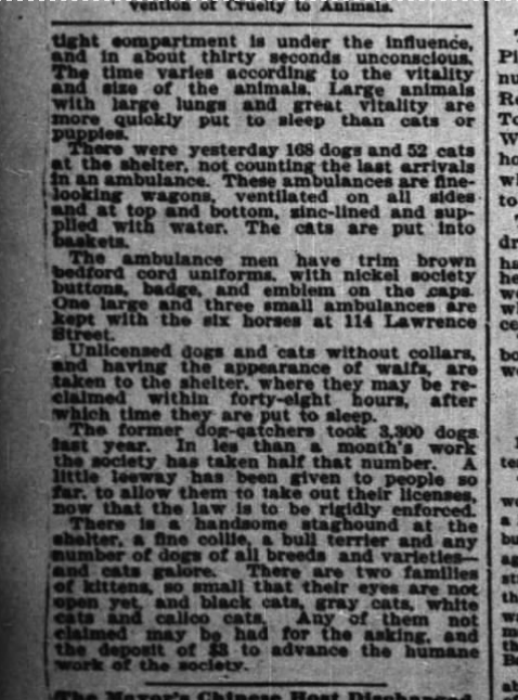 The dogs and cats are fed a quality diet consisting of “cornmeal, oatmeal, dog biscuits, bones and scraps.” This is the first time I’ve seen a description of the animal food used in shelters, and that in and of itself is very interesting. Within the prior model, they most likely would not have been fed or watered at all – this is consistent with all I have read aside from one piece where it describes “the dogs will not be fed offal.”