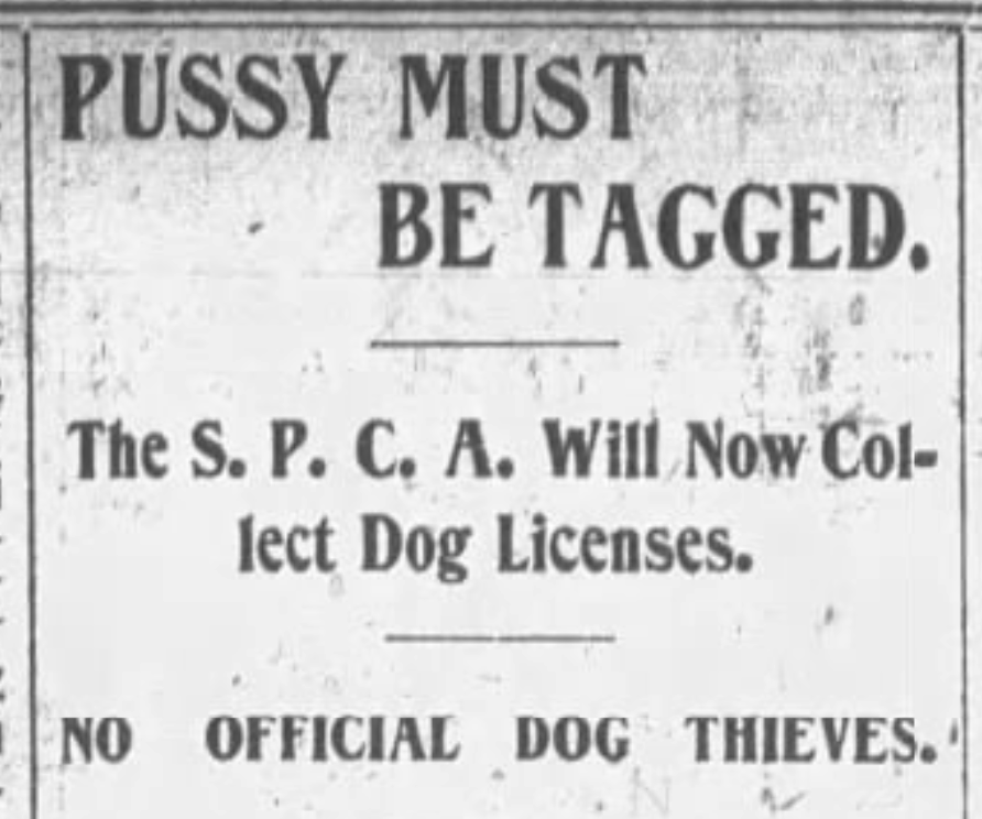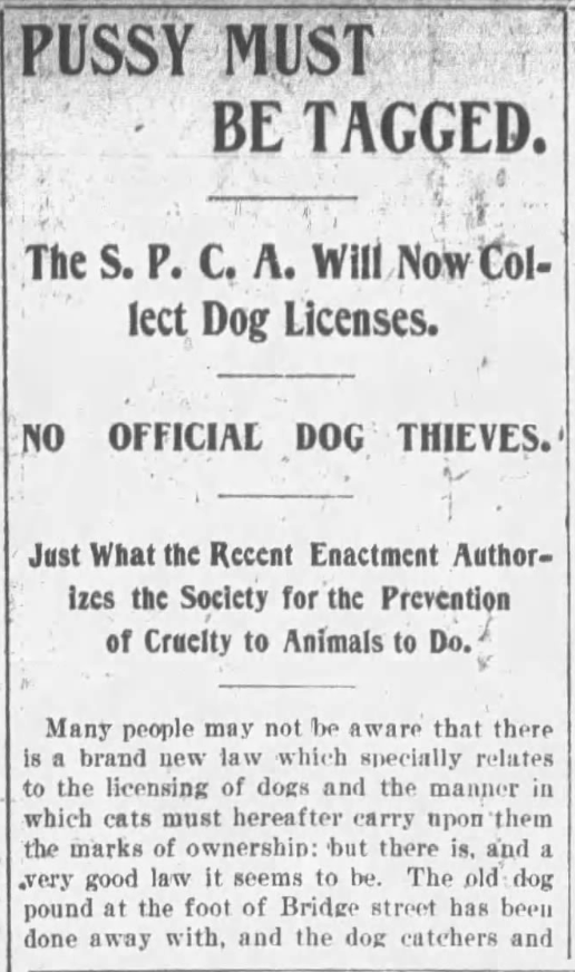 This morning, by way of example, an article from June 16, 1895, conveying to the public new laws about licensing for dogs and collaring for cats.