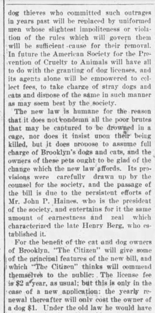 The first NYC dog licensing law was passed in 1894 in conjunction with the transition and it was the solution pro-offered in a direct response to this public outcry around theft. Licenses could be used to prove the dog was owned, and therefore not a public safety risk, particularly for rabies. (Which really wasn’t true, since the dogs weren’t vaccinated, but…rabies was confusing. There was definitely a prominent, if not universal, belief that owned dogs didn’t carry rabies, only strays did.) The law also excluded licensed dogs from impound.