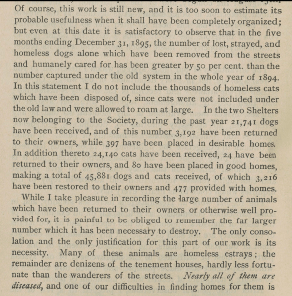 This period from 1894-1896 is an extremely pivotal one for the humane movement. Many of the things presented in this report as fact or necessity became foundational policies that still exist in shelters today – and I’d love to know what you see either in the articles or in the annual report.