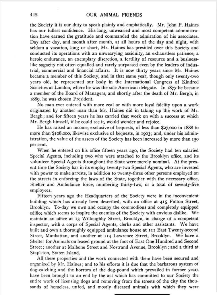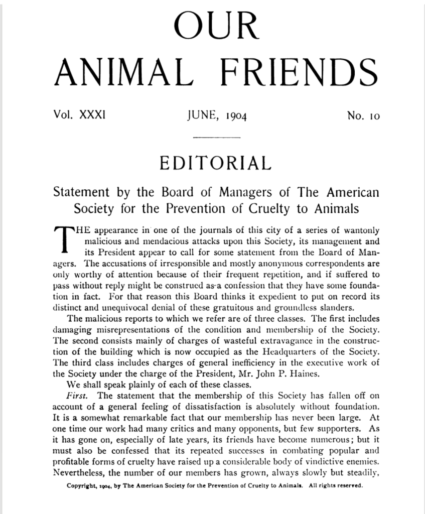 In June of 1904, in the midst of a round of slanderous newspaper articles (covered in part one of this story) surrounding John P. Haines, the A.S.P.C.A. Board of Managers issues a statement in the periodical of the organization, Our Animal Friends. The statement, signed by John Mason Knox, the treasurer of the board of managers, replies professionally and factually to the accusations the Henry Bergh Humane Society has brought forth about the effectiveness of the A.S.P.C.A. and the questions about it’s finances. It was reprinted in parts by the newspapers of the city – most notably in The Brooklyn Eagle, which noted that they received an advanced copy of Our Animal Friends and posted it almost in it’s entirety.