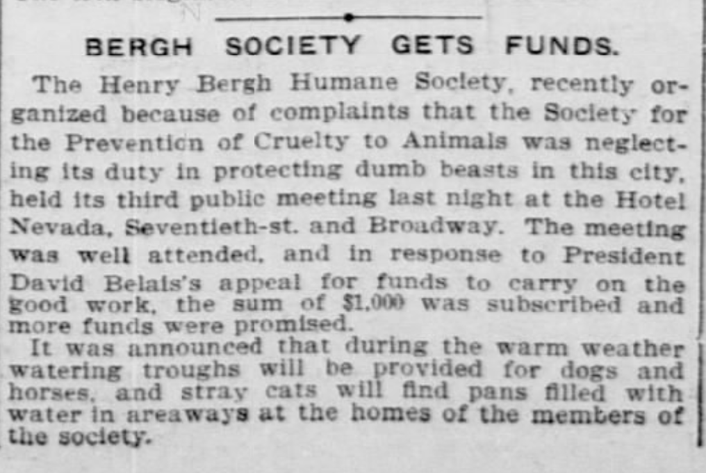 The ultimate goal of the Henry Bergh Society was to obtain the same powers of the A.S.P.C.A. to enforce cruelty laws in New York City. However, since the A.S.P.C.A. was in a legal position to be the sole provider of services, The Henry Bergh Society set upon an agenda to raise funds, establish some credibility and work “in spite of the old society.”