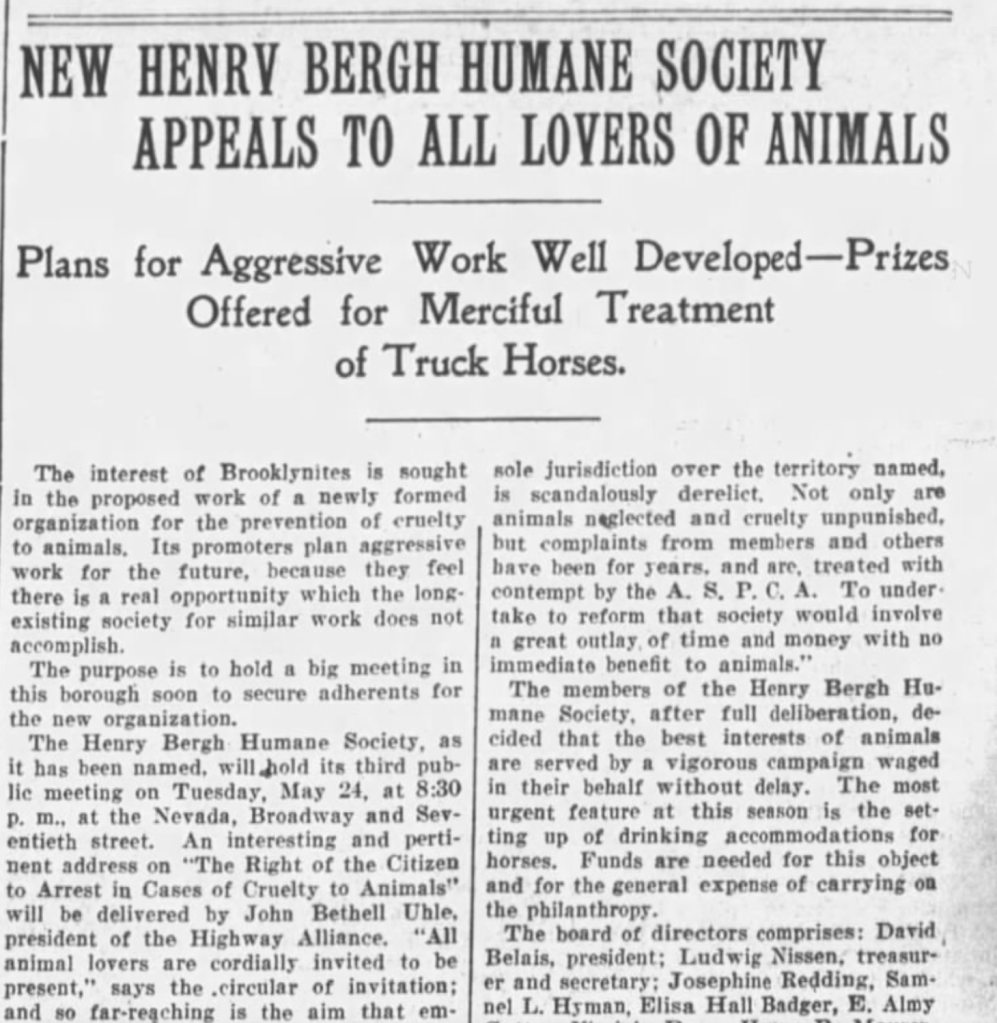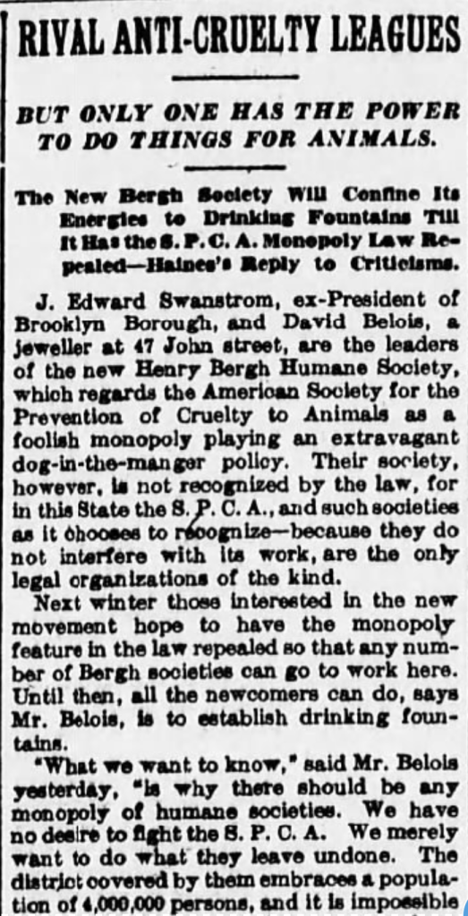 By June of 1904, the Henry Bergh Humane Society had begun to shift their focus away from solely calling out the incompetencies of the A.S.P.C.A. and toward developing an agenda for work. They alternated between mudslinging at the A.S.P.C.A. itself and it’s President, John P. Haines, and saying that they simply wanted to work alongside the A.S.P.C.A. since the area that the A.S.P.C.A. covered was too large for the organization to fulfill it’s duties.
