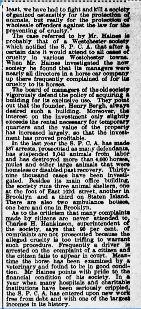 Meanwhile, John P. Haines defended the A.S.P.C.A.’s right to be the sole provider of services, saying “More than once it has fallen to our lot to defend the cause of animal protection not against it’s enemies, but against false or too officious friends. More times than a few it has been our painful duty to expose the cheap clap-trap of pretenders seeking to gain noteriety as champions of humanity while they neither knew nor cared one straw for the cause they professed to serve.”
