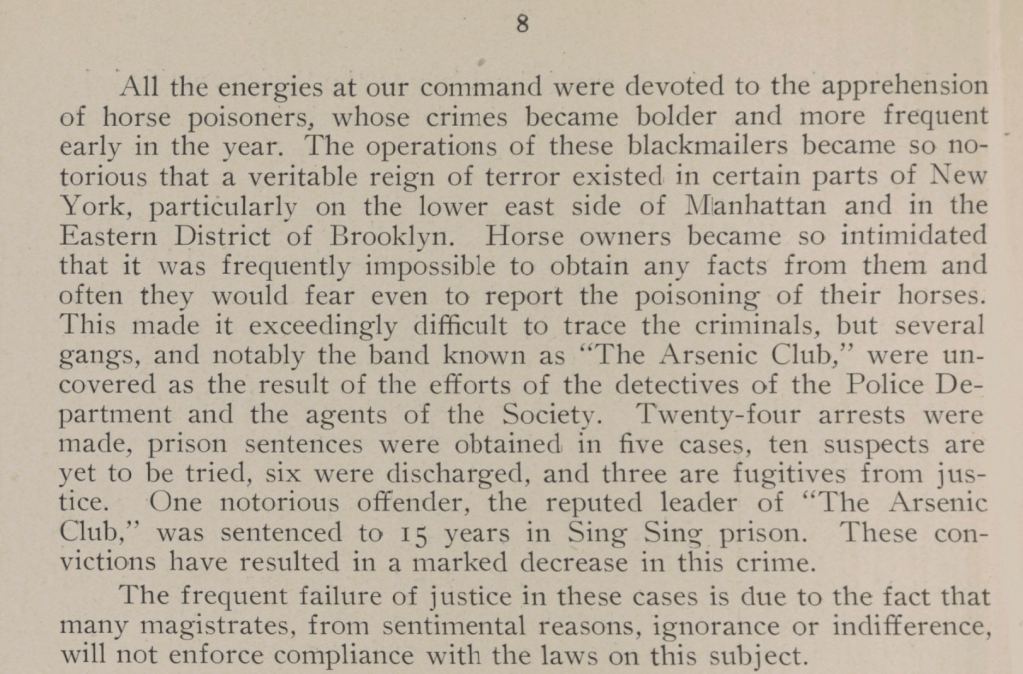 “I call this crowd “The Arsenic Club…because that is the poison they always use. They generally administer it in the form of a crueller in the feed bags as the animals stand on the street or throw it into the stalls. Sometimes it is injected into an apple.”