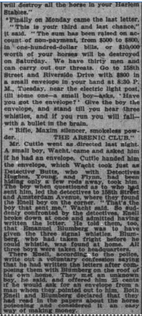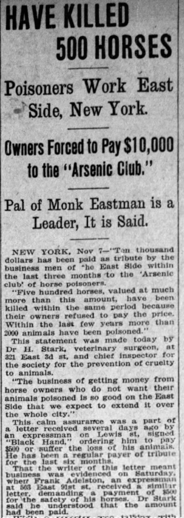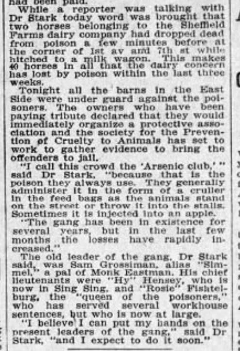 “Tonight all the barns on the East Side were under guard against the poisoners. The owners who have been paying tribute declared that they would immediately organize a protective association and the A.S.P.C.A. has been set to work to gather evidence to bring the offenders to jail.”
