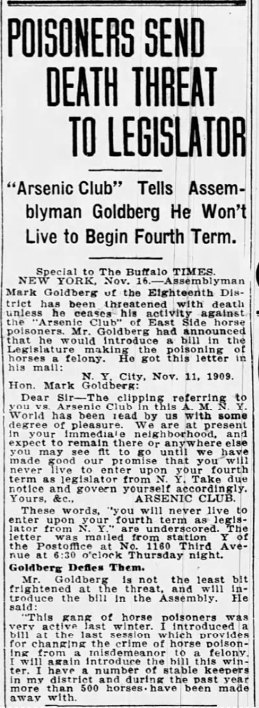 Meanwhile, Assemblyman Goldberg of the 19th district of New York introduces a bill to make horse poisoning a felony and promptly receives a letter from the Arsenic Club himself, threatening his life.