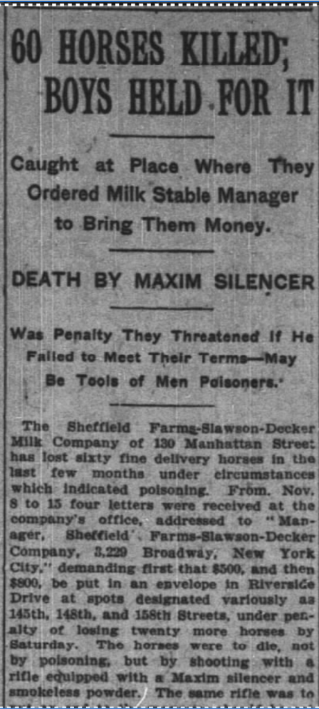 On Wednesday of that same week, the New York Times covered the loss of more than 60 horses at Sheffield Dairy, the same business that had lost the two horses hitched to a milk truck. The article below tells in detail the way that the crooks manipulated the business owners and threatened their lives, sending multiple letters and demands for money.