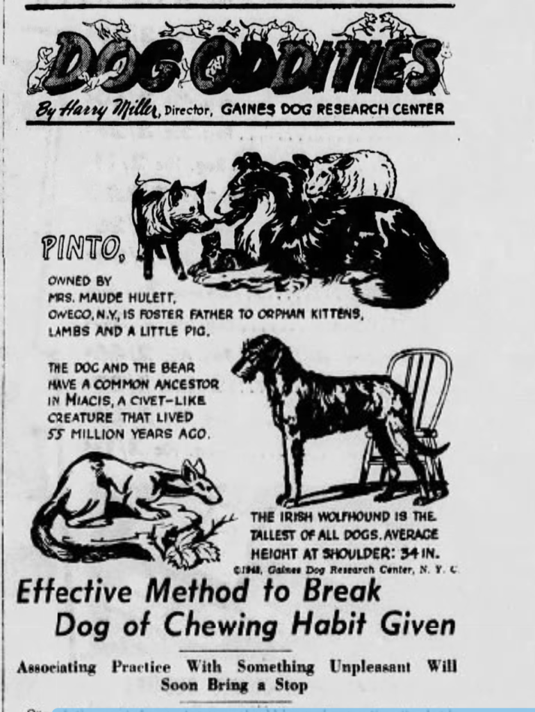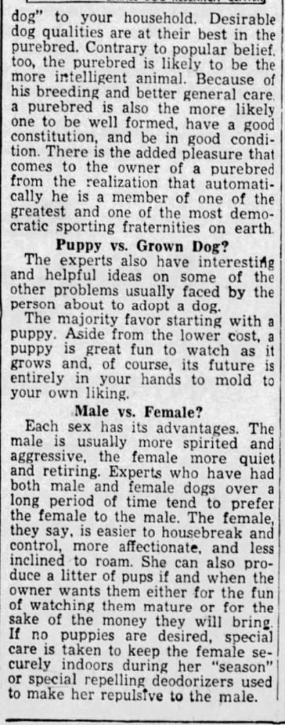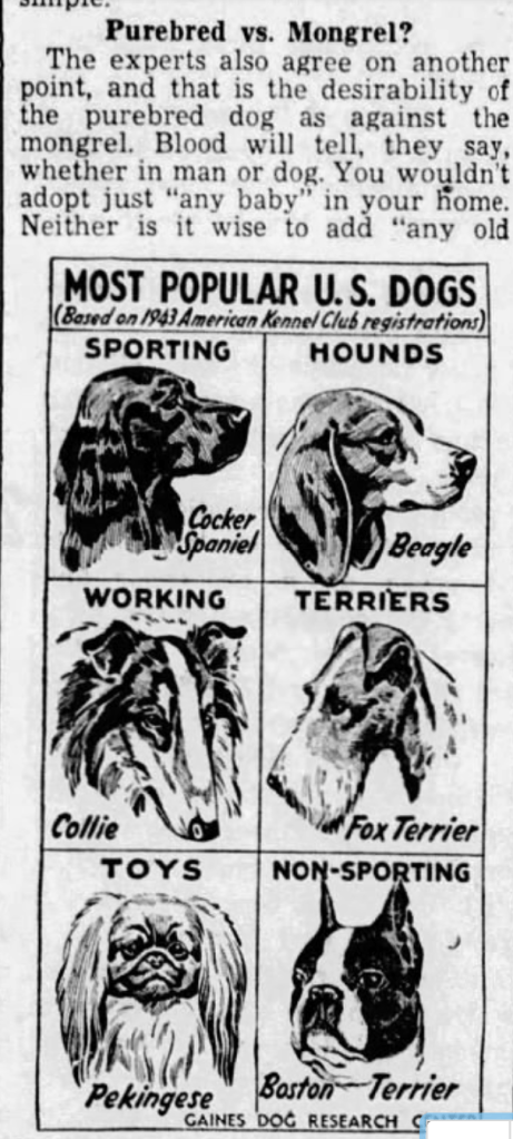 They also included content around how to select a dog that heavily emphasized that mixed breed…anything? was much less valuable than purebred. This piece was published in 1944 and ran in papers across the country; the timing makes it that much more awful.