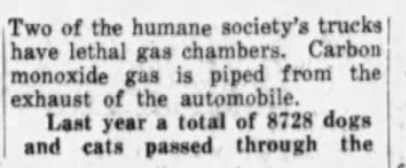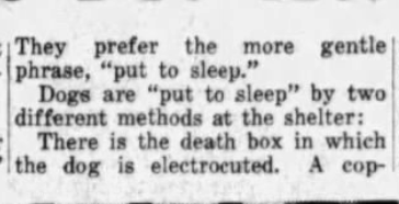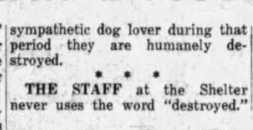 This piece stood out to me because it not only illustrates the societal views of shelter pets during this time period and talks about adoption, but also acknowledges the methodology of death of pets in shelters and the importance placed on licensing. Post 1930, the public mention of animals being killed in shelters sharply declines, so it was interesting to me to see it here in a form that is very reminiscent of much earlier mentions.