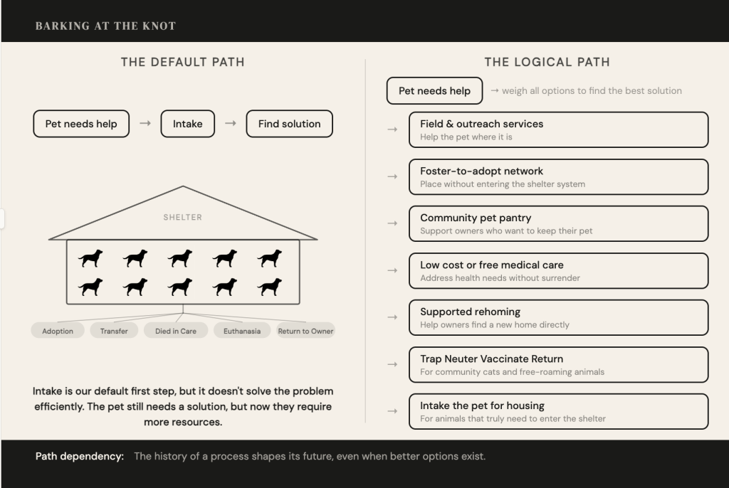 Managed intake itself is so widely misunderstood that there are entire facebook fandoms obsessed with “eliminating” it, perpetuating a myth that any other type of lifesaving that defers animals from physically entering the shelter immediately is a cruelty, even if entering the shelter ultimately kills them. That is crazy. It is path dependency on steroids. It is akin to cosplaying the victorian pound masters themselves.